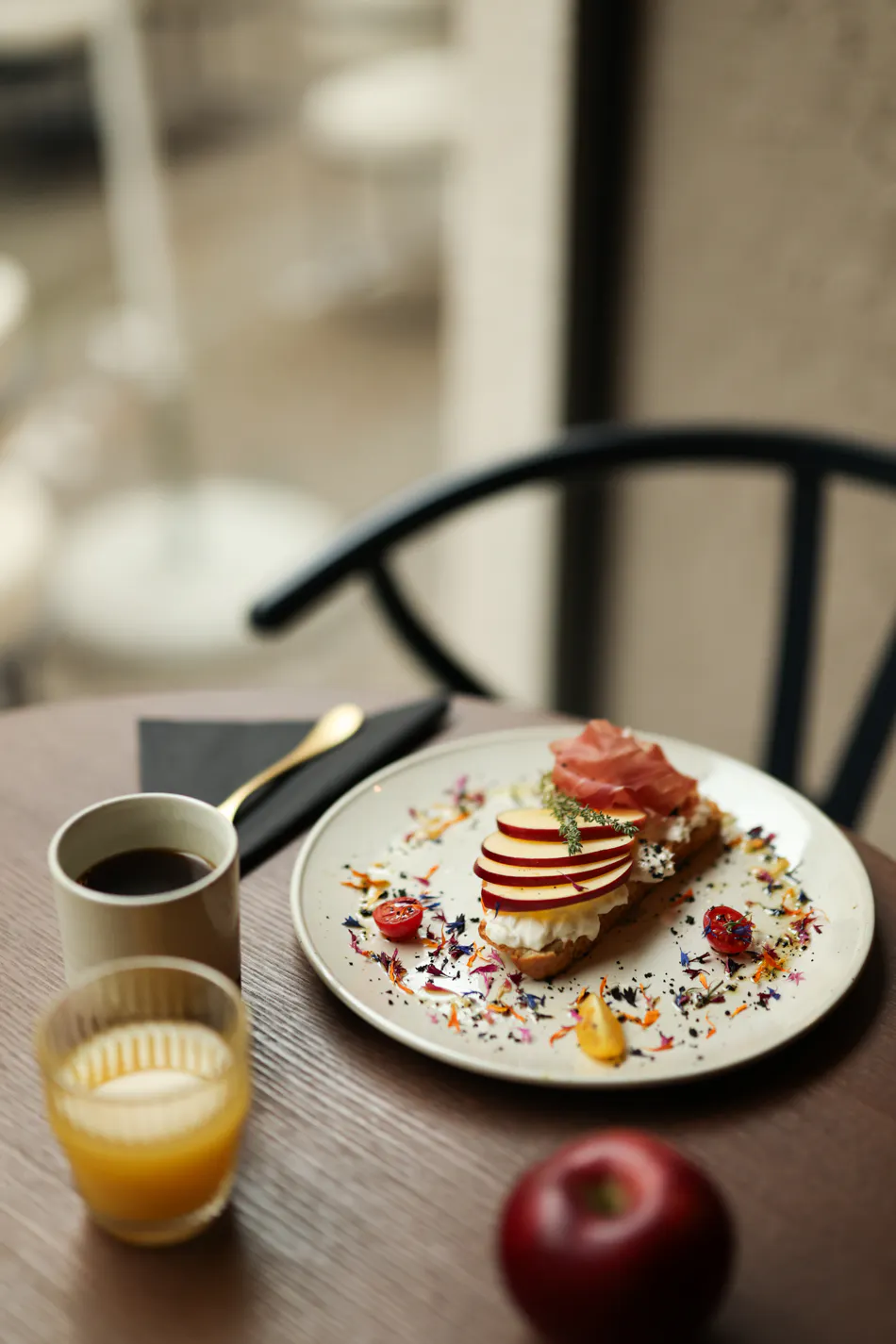 Geröstetes Sauerteigbrot mit cremiger Burrata, feinem Apfel und Rohschinken.