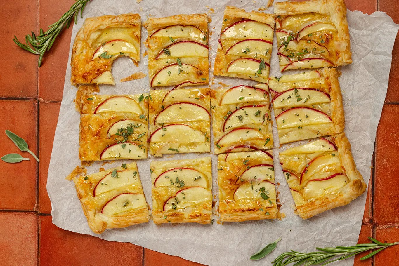 - Esparcir el queso Emmental rallado uniformemente sobre el hojaldre, dejando un borde de 2 cm.