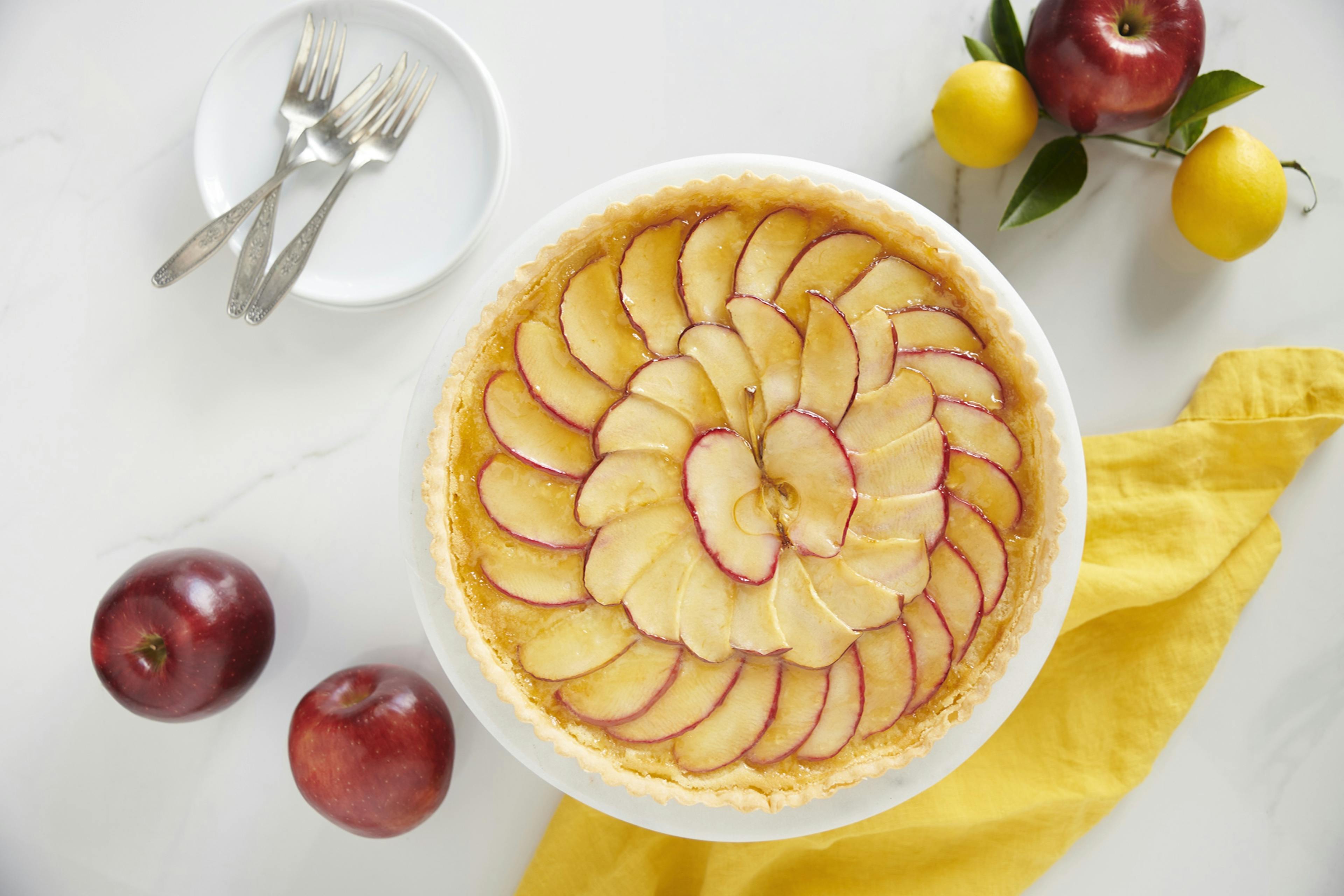 Tarta cremosa de limón con láminas de manzana.