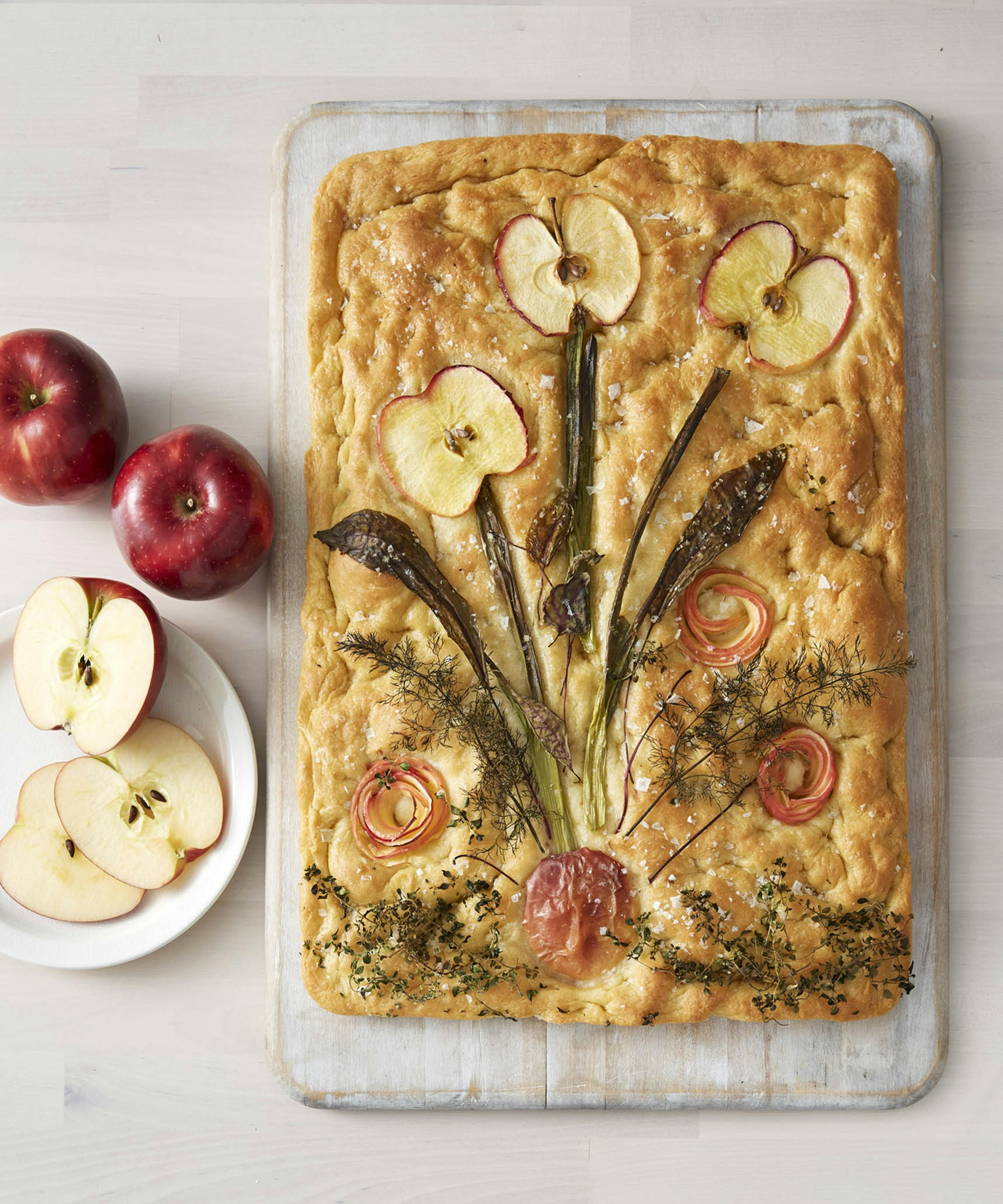 Focaccia esponjosa con manzana y decoración vegetal.